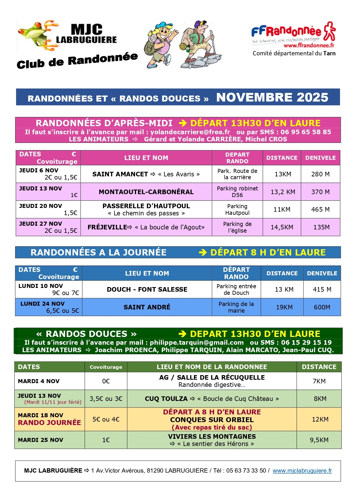Retrouvez ci-dessous le programme du club Rando de la MJC Labruguière pour le mois de